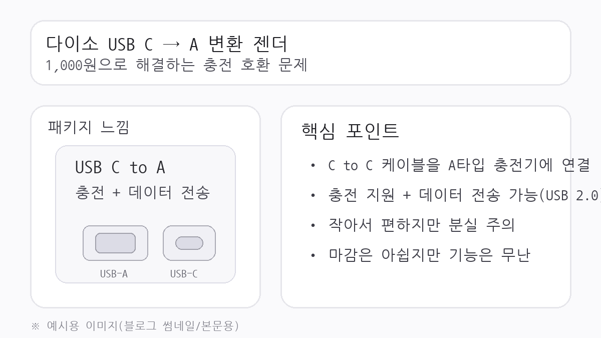 요즘 충전 케이블은 USB C to C가 기본이 됐죠.저도 어머니께 새 케이블을 드리면서 C to C 제품을 골랐는데,막상 집에서 쓰시던 고속 충전기 포트가 USB-A라 바로 사용이 안 되더라고요. 그래서 ‘C타입을 A타입으로 바꿔주는 변환 젠더’가 필요해졌고,급한 김에 가까운 다이소를 들렀습니다. 결론부터 말하면, 1,000원으로 깔끔하게 해결됐어요.제가 산 제품은 USB C to A 변환 젠더로, 포장 전면에 제품명과 특징이 크게 적혀 있고실물을 투명 케이스로 보여줘서 고르기 쉬웠습니다. 뒷면에는 ‘충전 지원 / 데이터 전송 가능’이 아이콘으로 정리돼 있었고,전송은 USB 2.0(최대 480Mbps) 수준이라 안내되어 있었습니다.즉, C타입 장치를 연결해도 A타입 환경에서 가능한 범위로 동작하는 ‘하..