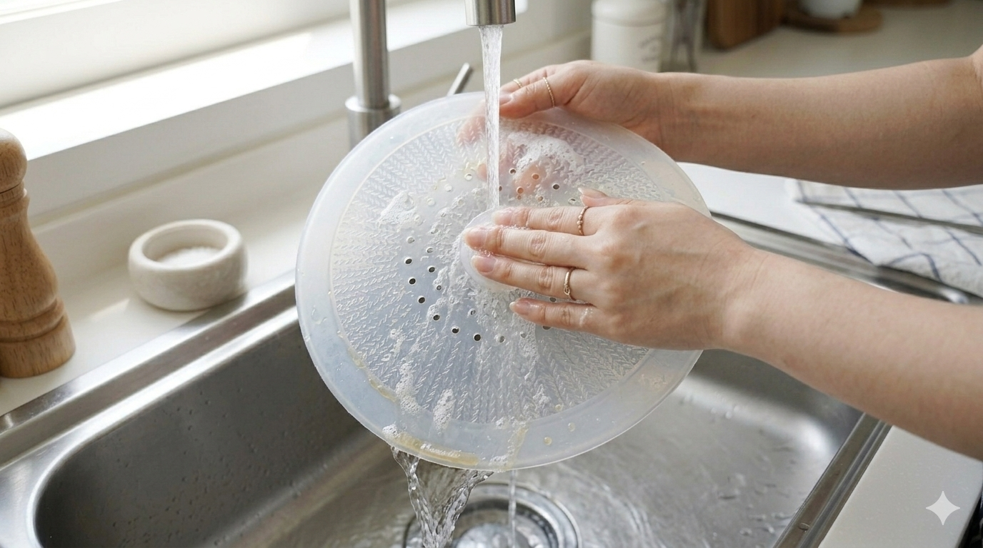 가장 마음에 드는 건 설거지가 너무 편하다는 거예요. 실리콘이라 기름때가 미끄러지듯 씻겨 나가고, 스펀지로 살살만 닦아도 깔끔해져요. 세척이 쉬우니까 자주 쓰게 되고, 자주 쓰니까 주방이 확실히 깔끔해지더라고요. 냉동 보관, 전자레인지 사용도 가능해서(구멍이 있으니 뚜껑 덮은 채 데우기도 OK) 활용 폭이 넓어요. 그리고 무게가 가벼워서 냄비 위에 올려도 불안하지 않고, 둘둘 말아서 서랍에 수납하기도 쉬워요.